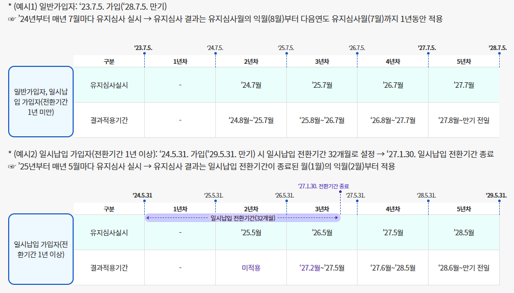 - 가입 후 다음 연도부터 매년 가입 월 기준으로 심사 진행.