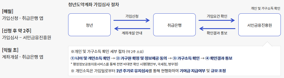 - 대상자 확정 → 개인소득 확인 → 정부기여금 지급 비율 확정 → 심사 결과 통보 → 적용.